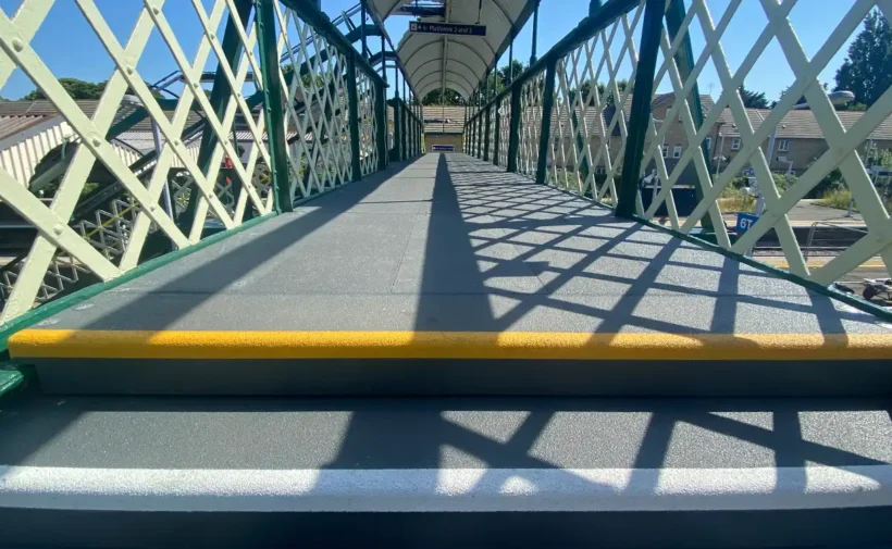 Our lightweight, durable composite dagger boards achieve a EN13501 Class B – s1 d0 fire rating that’s ideal for canopy projects as a fit-and-forget solution. We also design and supply award-winning footbridge treads and landings, end-of-platform gates, steps and fencing – all made from our advanced d² product range with its low embodied carbon and full recyclability.